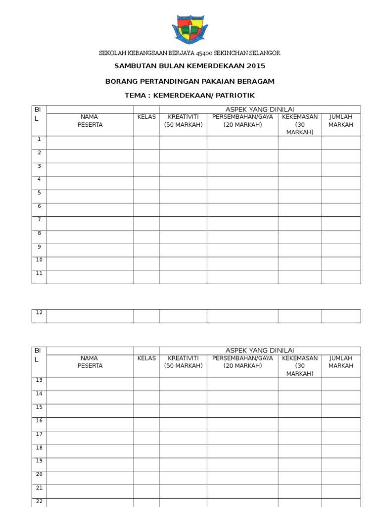 Borang Markah Pertandingan Pakaian Beragam Docx Docx Document